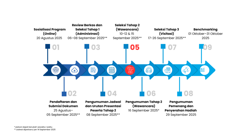 Gambaran umum mengenai timeline kegiatan ini dapat dilihat secara rinci dalam materi yang telah disiapkan dan dibagikan kepada peserta. Materi tersebut mencakup semua tahapan dan jadwal kegiatan, mulai dari persiapan hingga pelaksanaan akhir, dan dapat diakses melalui website resmi Pelindo TJSL Awards 2025. Peserta diharapkan untuk merujuk ke materi ini untuk mendapatkan informasi lengkap tentang jadwal dan detail kegiatan yang harus diikuti sepanjang program berlangsung.